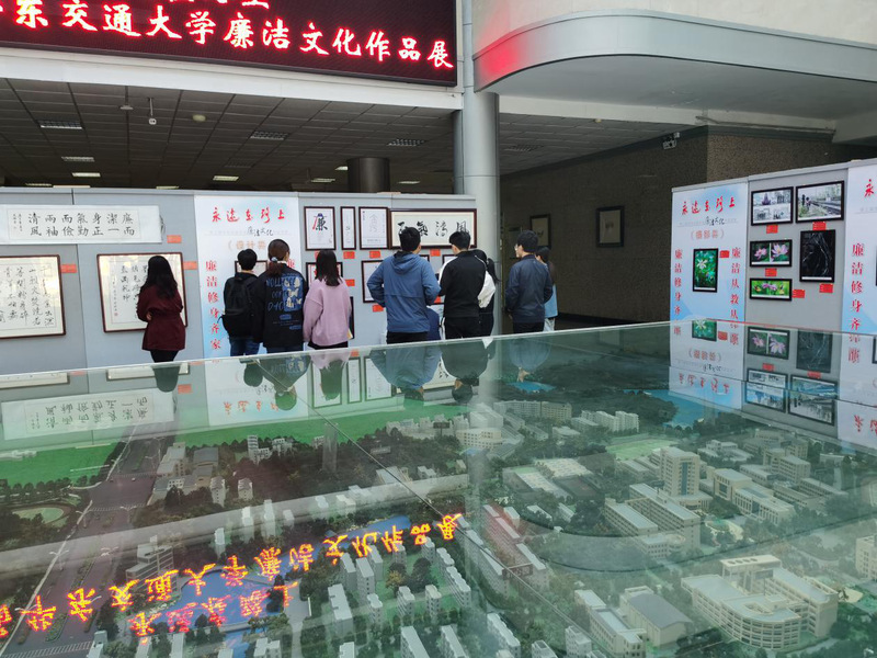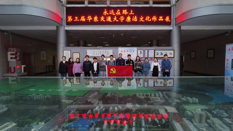 2020年11月13日早晨八点,环境工程学生党支部书记刘伟带领环境工程党支部的全体学生党员参观了《永远在路上》第三届华东交通大学廉洁文化作品鉴赏展览。其共展出作品40件,涵盖书法、绘画、摄影和设计四个类别,全部由各基层党组织报送,学校广大师生创作。