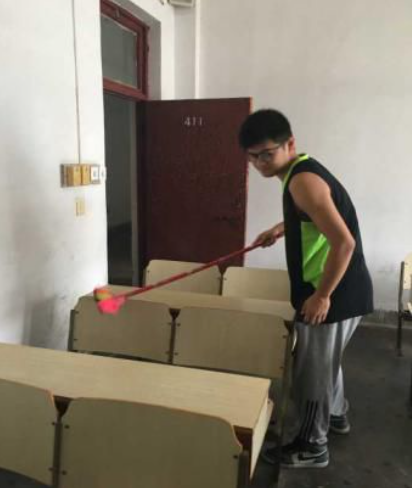 第十五组:在组长殷勤的带领下,第十五组成员针对逸夫楼的楼道卫生和教室卫生进行了一次打扫,并把黑板留下的粉笔字擦去,方便接下来上课的师生。同时,大家一起把摆放混乱的座椅摆放归位。