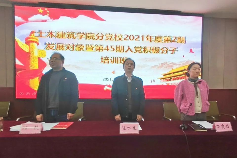 2021年11月25日,国产视频 分党校2021年度第2期发展对象暨第45期入党积极分子培训班开班典礼在土建楼200教室举行。出席本次开班典礼的领导老师有:土建学院党委书记、分党校校长陈水生,土建学院党委副书记、分党校副校长郑轶,土建学院党委组织员万雯怡。土建学院本期学生发展对象和入党积极分子、全体学生党员参加本次开班典礼。