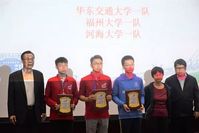 华东交通大学校长罗玉峰宣布本届华东地区高校结构设计邀请赛获奖名单:福州大学二队获得特等奖,华东交通大学一队、福州大学一队、河海大学一队获得一等奖,华东交通大学二队、华侨大学一队、华侨大学二队、河海大学二队、中国矿业大学一队、合肥工业大学二队、合肥工业大学一队获得二等奖,青岛理工大学二队、中国矿业大学二队、青岛理工大学一队、东南大学一队、南京航空航天大学一队、南昌大学一队、山东大学一队、南昌大学二队、南昌工业大学一队、东南大学二队、南京航空航天大学二队获得三等奖。