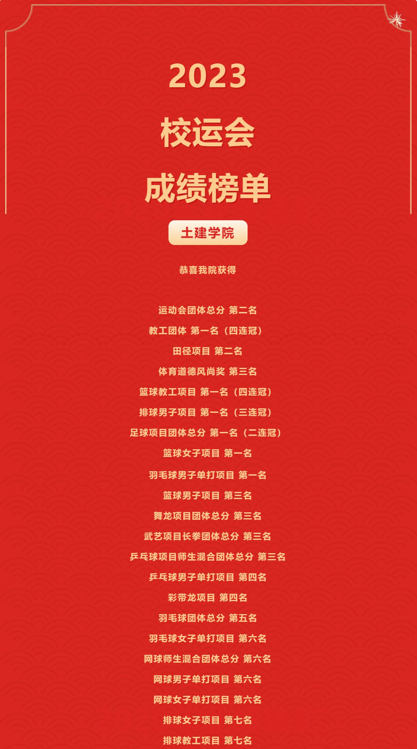 在今年的体育运动盛宴中,土建的师生们不仅传承了体育精神,也彰显了青春活力,重现了土建雄风。尤为突出的是,在本届校运动会,土建学子在田径项目中斩获金牌8枚,同时还刷新了男子800米、男子4×400米接力的校运会记录,以总分212分(较去年高出90分)获得田径项目全校第二!在球类等单项赛事中,再次问鼎学生男足、男排、女篮冠军,最终也取得了运动会总分第二的出色成绩,刷新了学院在校运会上十余年来最好成绩,实现了新的突破!此外,土建学院的教工团体又以总分第一名的表现傲视群雄,连续四年蝉联总分第一名,并展现了持续进步的势头。