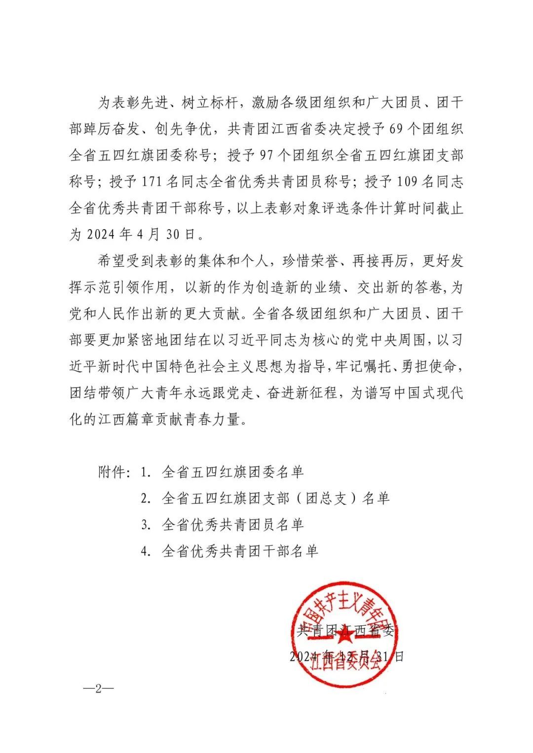 近日,共青团江西省委正式发布了《赣青发〔2024〕19号关于表彰全省五四红旗团委(团支部)、全省优秀共青团员、全省优秀共青团干部的决定》,国产视频团委书记万雯怡老师获评“全省优秀共青团干部”,2021级建筑学专业赵天娇同学获评“全省优秀共青团员”。