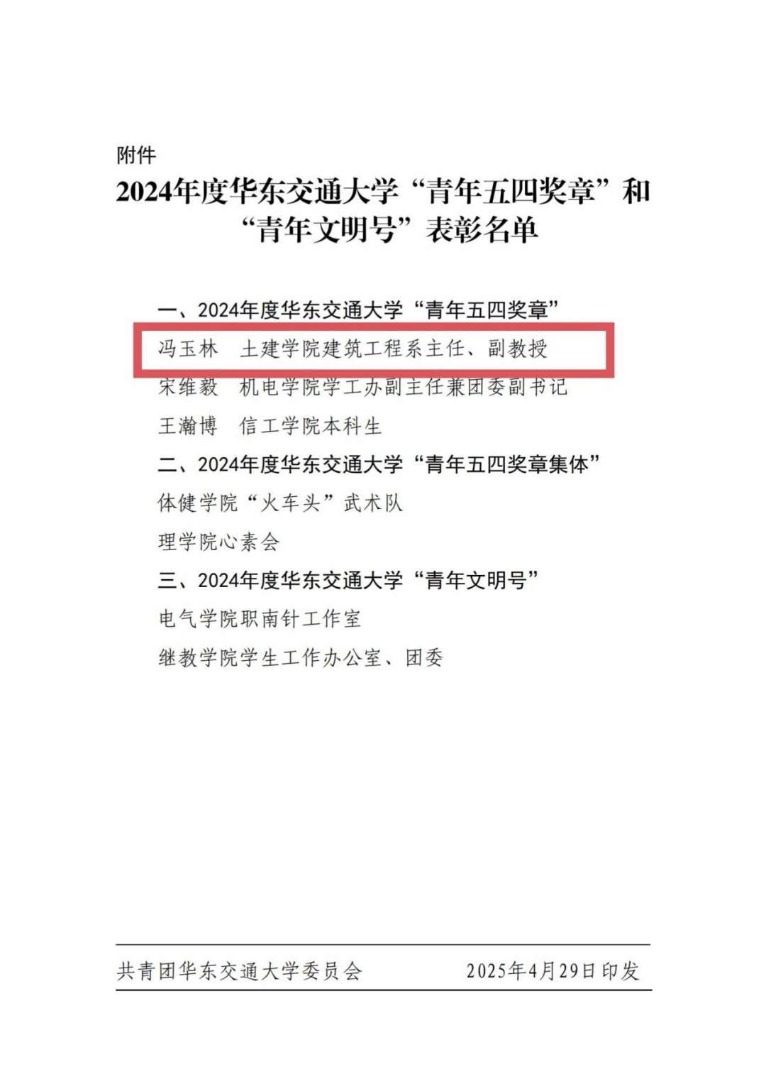●冯玉林老师荣获2024年度华东交通大学“青年五四奖章”。