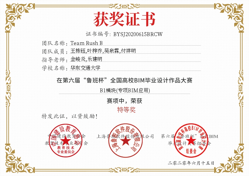 金峻炎和乐建明老师指导,来自工程管理专业的王栋钰、吴泉霖、付祥明、叶梓乔同学组成的“Team Rush B”团队经过和西南交通大学、中国海洋大学、兰州交通大学、云南大学等200余所高校、近500多支参赛队伍的激烈的比拼角逐,最终获得了本次大赛的特等奖,并赢得了价值40000元的软件使用权。