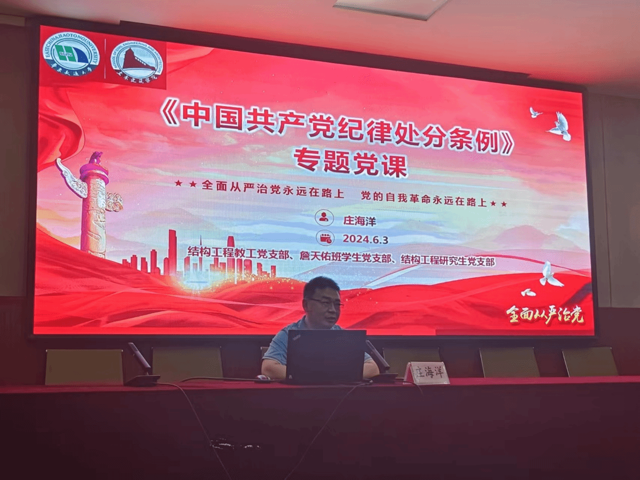 院长庄海洋为结构工程教工党支部、詹天佑班学生党支部和结构工程研究生党支部全体党员讲授《中国共产党纪律处分条例》的专题党课。