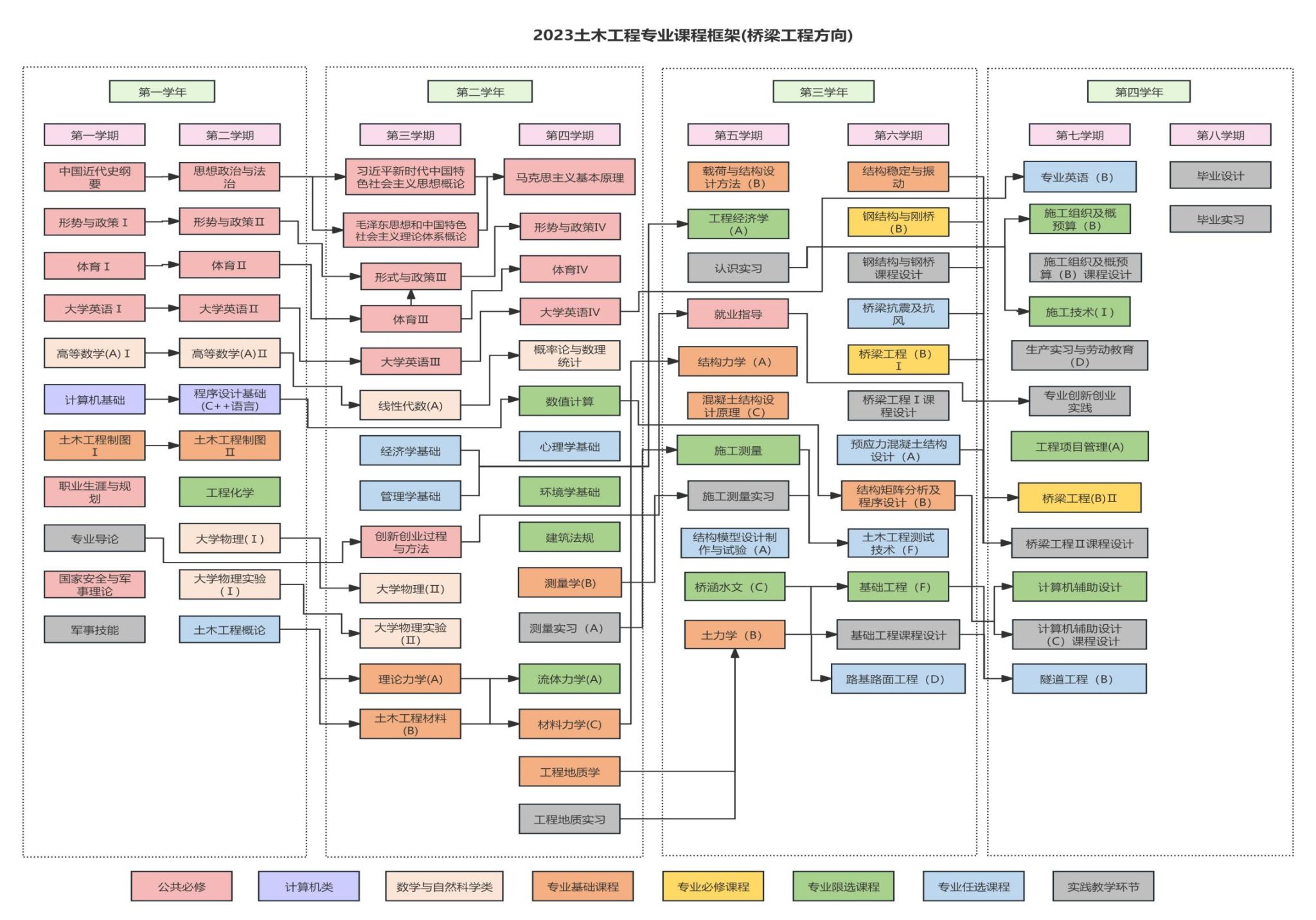 土木工程概论、土木工程制图、理论力学、材料力学、结构力学、测量学、土木工程材料、流体力学、土力学、基础工程、荷载与结构设计方法、混凝土结构设计原理、桥梁工程、钢结构与钢桥、桥涵水文、施工技术、工程项目管理、施工组织与概预算、隧道工程、路基路面工程、桥梁抗震及抗风、计算机辅助设计。