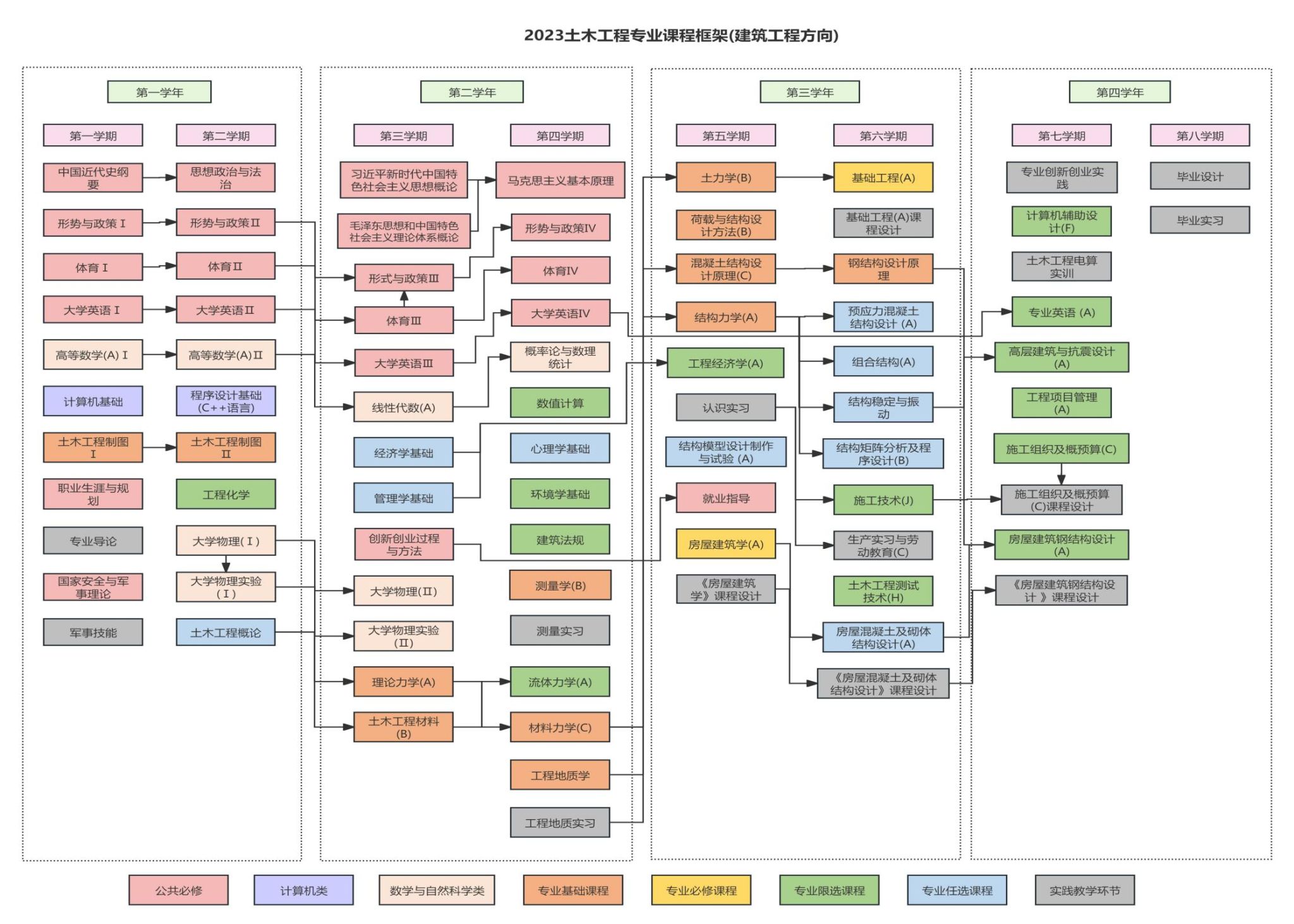 土木工程概论、土木工程制图、理论力学、材料力学、结构力学、测量学、土木工程材料、流体力学、土力学、基础工程、混凝土结构设计原理、房屋建筑学、房屋混凝土及砌体结构设计、钢结构设计原理、荷载与结构设计方法、房屋建筑钢结构设计、高层建筑与抗震设计、施工技术、工程项目管理、施工组织与概预算、计算机辅助设计。