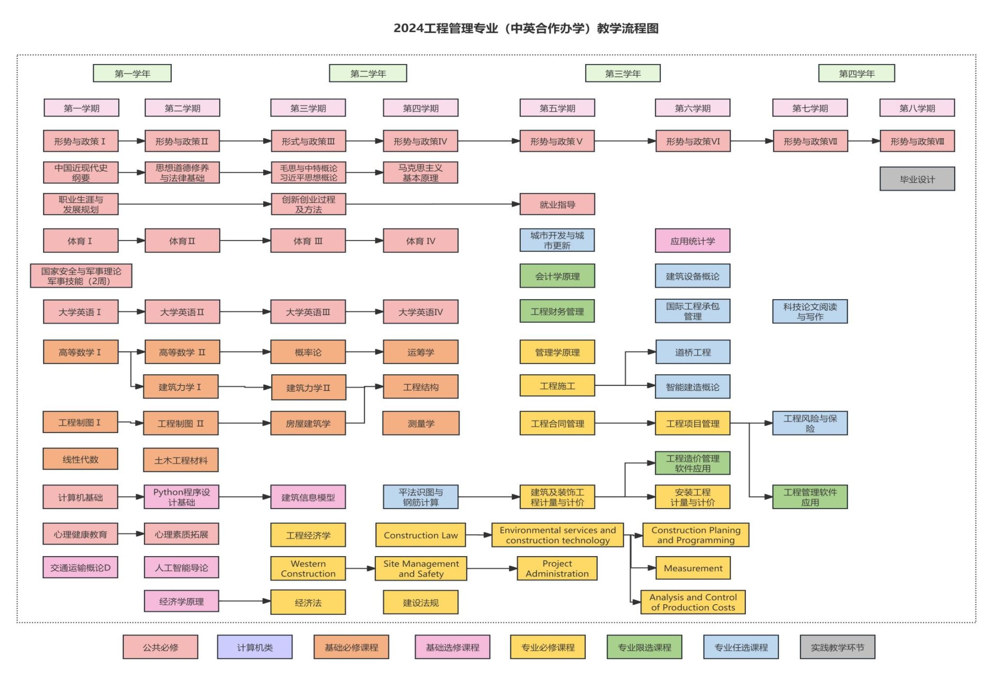 以习近平新时代中国特色社会主义思想为指导,以本科专业类教学质量国家标准、专业类指导规范、中外合作办学要求为依据,面向国内外工程管理领域,依托本校土木工程学科优势,培养家国情怀、国际视野,德、智、体、美、劳全面发展,掌握土木工程领域的技术知识以及与工程管理相关的管理、经济和法律等基础知识,具备较高的专业综合素养、较强的实践应用能力,获得良好的创新思维训练并具有初步的创新能力,能够严格遵守工程伦理,在国内外工程建设领域从事全过程工程管理的“懂技术、善经营、会管理、精商务、懂法守法”的高级专门人才。