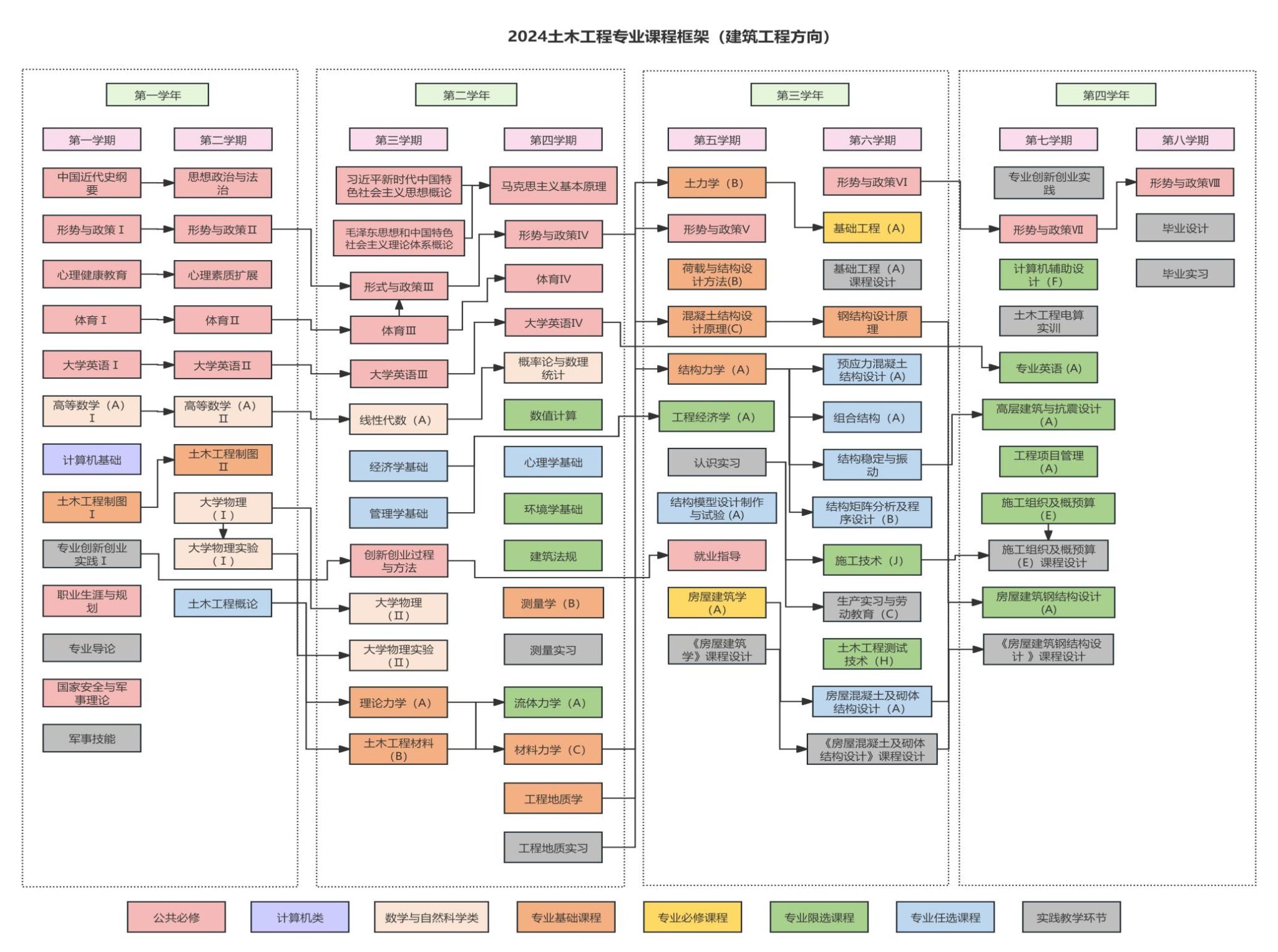 土木工程概论、土木工程制图、理论力学、材料力学、结构力学、测量学、土木工程材料、流体力学、土力学、基础工程、混凝土结构设计原理、房屋建筑学、房屋混凝土及砌体结构设计、钢结构设计原理、荷载与结构设计方法、房屋建筑钢结构设计、高层建筑与抗震设计、施工技术、工程项目管理、施工组织与概预算、计算机辅助设计。