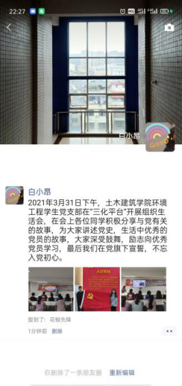 活动结束后,支部党员通过微信、微博等新媒体平台,用文字、视频等形式,讲述自己的所见所感所想,发表自己在三化平台学习的感悟。