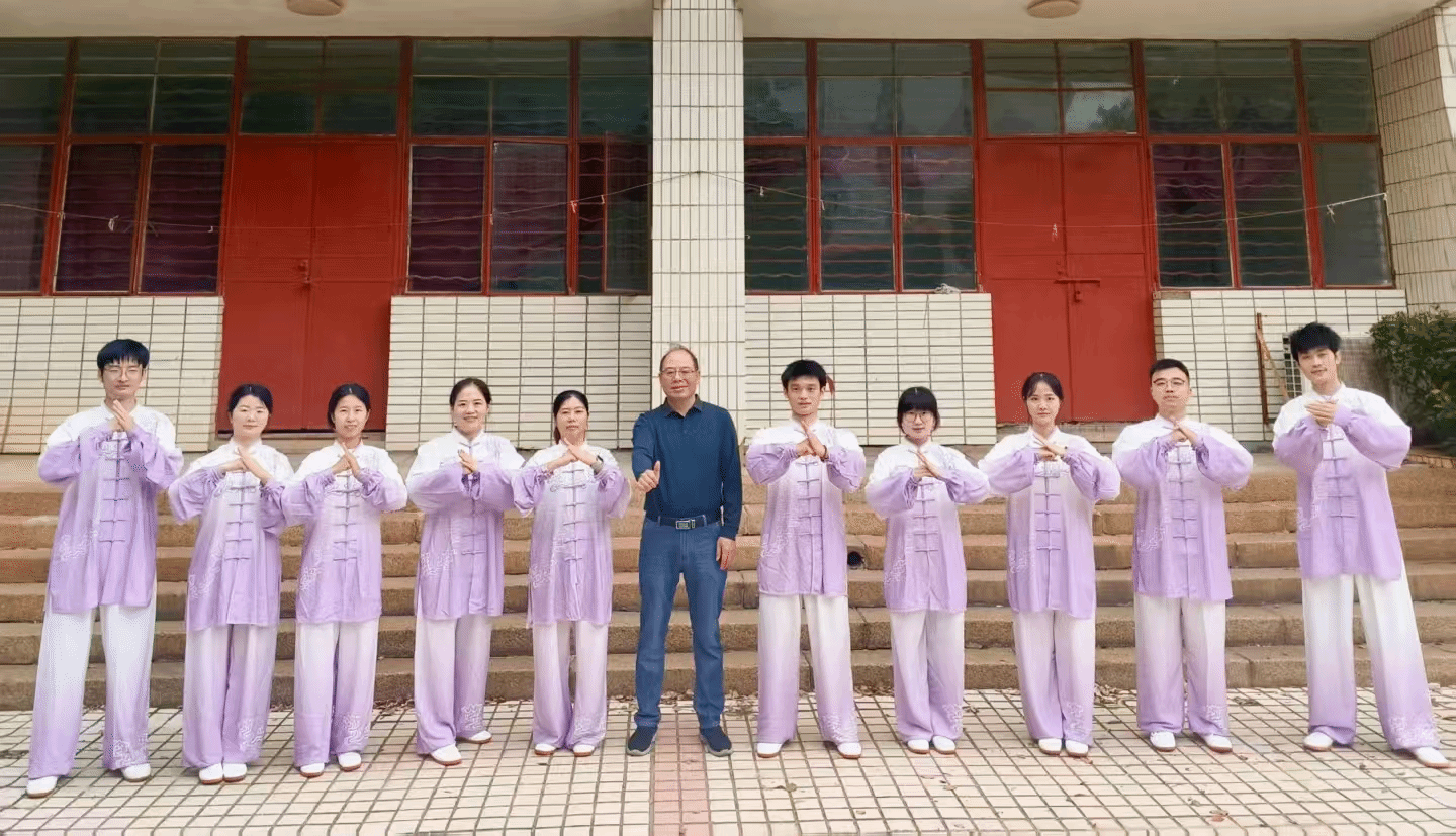 在团体二段长拳项目中,队员们随音乐起势,衣袂翩跹如松间鹤舞,云手翻转似流水行云。白鹤亮翅展气贯长虹之势,金鸡独立显稳若磐石之姿,刚柔并济的招式尽显太极神韵。