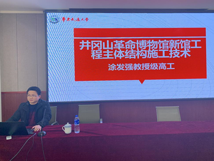 涂发强以“井冈山革命博物馆新馆工程主体结构施工技术”为题,主要介绍了井冈山革命博物馆新馆工程施工有关情况。通过采取先主体框架、后地下层底板的逆作法施工技术,达到了保证工程如期交付使用的工期要求。通过提出设计施工双优化,将报告厅大跨度的深梁改为预应力结构,优化了设计功能,并提出针对性的解决办法。创新施工工艺,采取技术措施对超长结构一次性浇筑混凝土,避免了留设后浇带施工。就师生提出的相关专业性问题,涂总一一作了精辟的回答。
