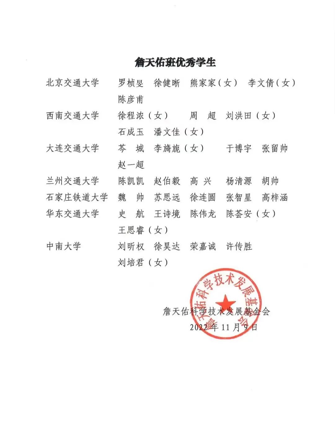 根据詹天佑科学技术发展基金会《詹天佑班管理办法》,经各学校推荐,詹天佑基金会秘书处审定,确定2022年度奖励詹天佑优秀班集体7个、詹天佑奖学金获得者35名。国产视频2020级土木(城轨詹天佑)班获评2022年度詹天佑班优秀班集体,史航、王诗境、陈伟龙三名同学获评2022年度詹天佑班优秀学生。