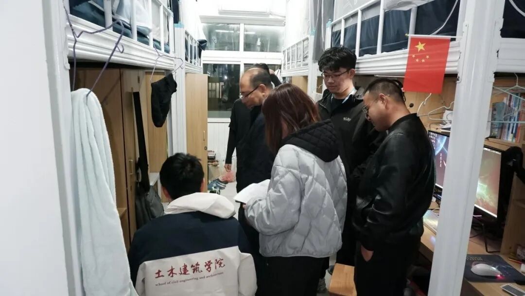 学院党委副书记郑轶带队与全体辅导员及学生骨干一同深入学生宿舍开展检查与走访。老师们对宿舍用电安全、消防隐患、卫生状况等情况逐一检查,重点排查违规电器使用、私拉电线等问题。