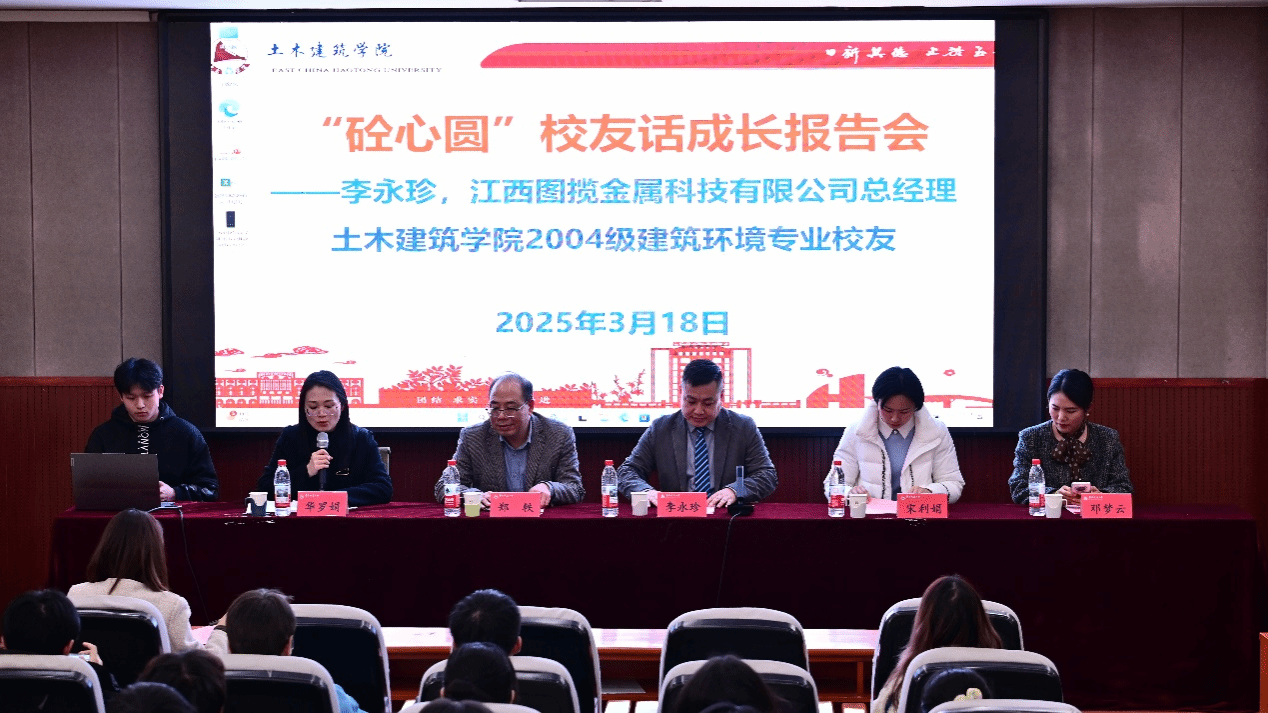 3月18日下午,国产视频邀请2004级建环专业校友、江西图揽金属科技有限公司总经理李永珍,在教9栋200报告厅举行“砼心圆”校友话成长报告会。江西图揽金属科技有限公司综合部经理宋利娟、销售部经理邓梦云,土建学院党委副书记郑轶、学工办主任万雯怡及2024级学生代表参会,报告会由学工办副主任华罗娟主持。
