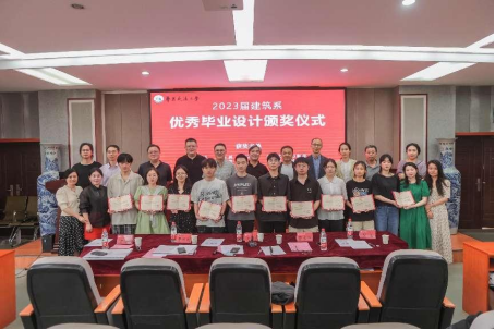 建筑系优秀本科毕业设计颁奖仪式,五位评委专家为获奖的10名同学颁奖并合影留念。